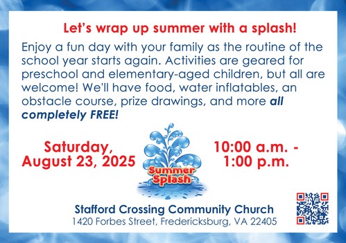 Bring the whole family and join us at the campus of Stafford Crossing Community Church for a wet 'n wild time. We’ll have hot dogs, snow cones, cotton candy, water inflatables, a bounce house, an area just for tiny tots, games, playground and more--all completely FREE.
