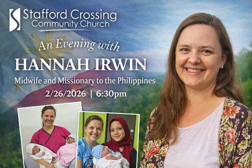 Join us Thursday, February 26 at 6:30 p.m. at Stafford Crossing for an enjoyable evening with Hannah Irwin, Midwife and Missionary to the Philippines.